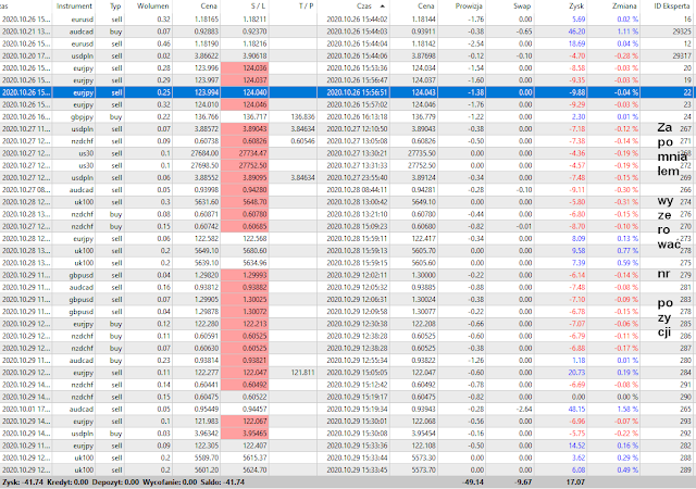 Pierwsze dwa dni tygodnia były kluczowe dla ostatecznego wyniku. Jak widać głównie prowizje tutaj zjadły dużo kapitału.Na koniec udało mi się ostatniego dnia wyjść na zero i tylko szkoda 2 błędów, bo było by lepiej.